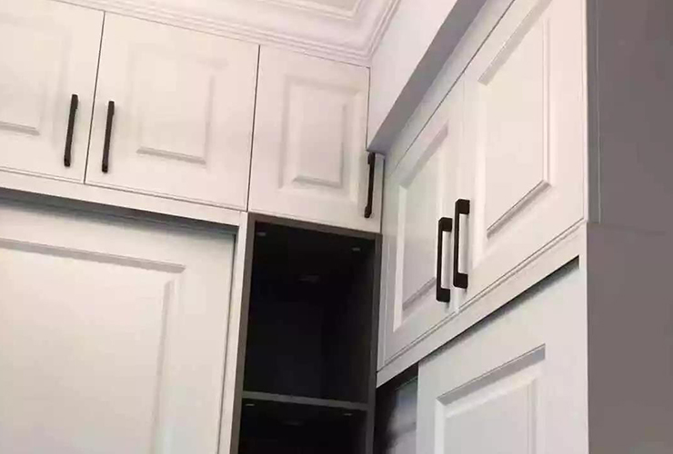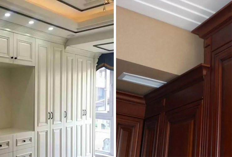 解决办法:白纸黑字写清楚上面要留空,柜子不要做顶线,做到顶,客户去买石膏线回来柜子上封板走石膏线。