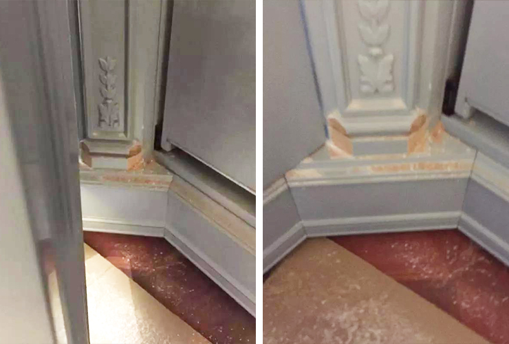 错误位置:转角45°罗马柱设计的时候没有考虑到罗马柱底座较为宽大影响了门板的开启,蹭着客户不知道现场切割后补漆,勉强蒙混过关~!