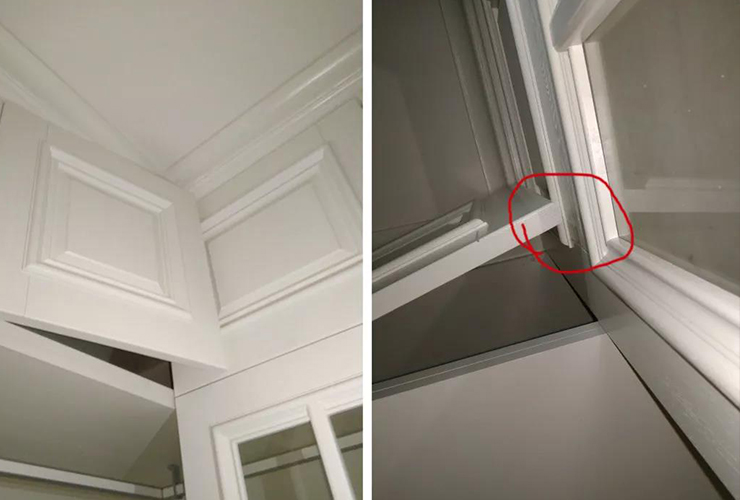 左图错误位置:侧面没有加收口板,露出了封边条,顶部没有做满,留出空隙。